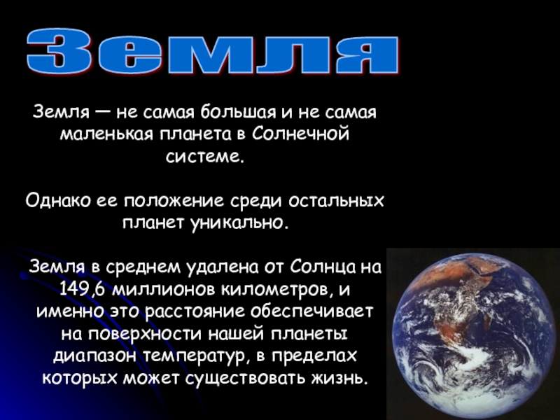 Земля в среднем удалена от Солнца на 149,6 миллионов километров, и именно это расстояние обеспечивает на поверхности нашей планеты диапазон температур, в пределах которых может существовать жизнь.