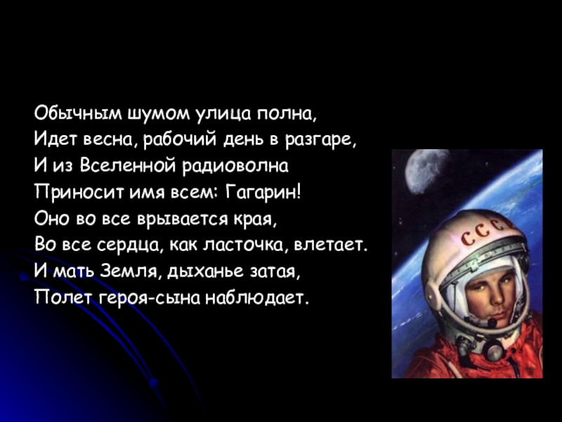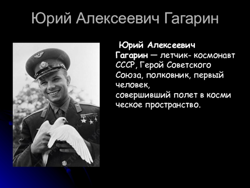 Юрий Алексеевич Гагарин — летчик- космонавт СССР, Герой Советского Союза, полковник,