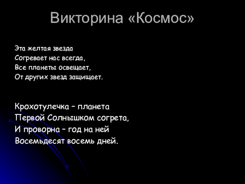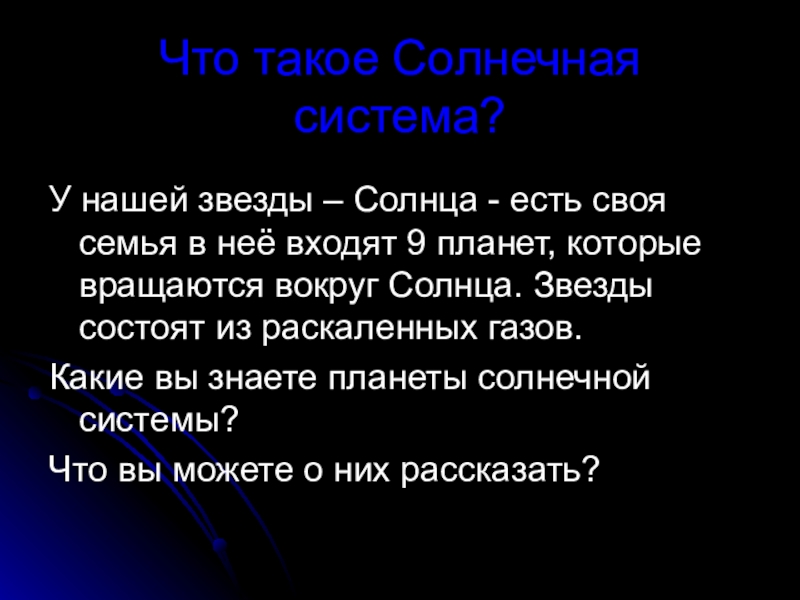 семья в неё входят 9 планет, которые вращаются вокруг Солнца. Звезды состоят из раскаленных газов.