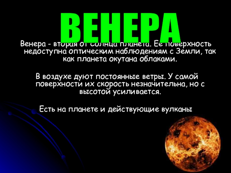 Слайд 9Венера - вторая от Солнца планета. Ее поверхность недоступна оптическим наблюдениям
