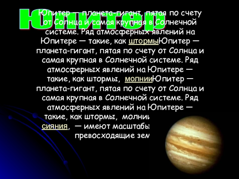 самая крупная в Солнечной системе. Ряд атмосферных явлений на Юпитере — такие, как штормыЮпитер — планета-гигант, пятая по счету от Солнца и самая крупная в Солнечной системе. Ряд атмосферных явлений на Юпитере — такие, как штормы, молнииЮпитер — планета-гигант, пятая по счету от Солнца и самая крупная в Солнечной системе. Ряд атмосферных явлений на Юпитере — такие, как штормы, молнии, полярные сияния, — имеют масштабы, на порядки превосходящие земные
