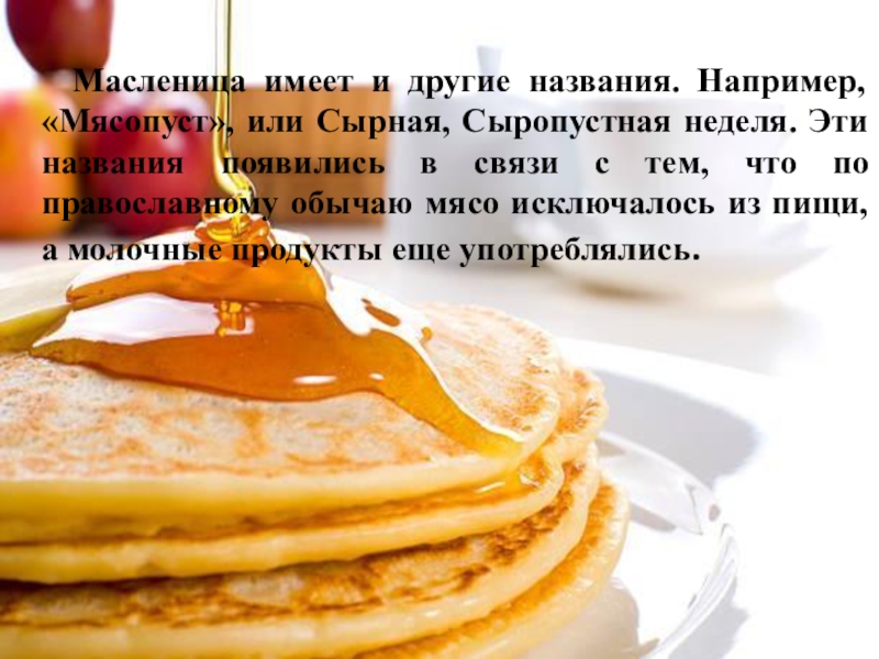 или Сырная, Сыропустная неделя. Эти названия появились в связи с тем, что по православному обычаю мясо исключалось из пищи, а молочные продукты еще употреблялись.