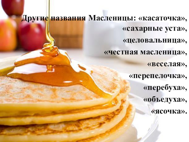 Другие названия Масленицы: «касаточка», «сахарные уста»,