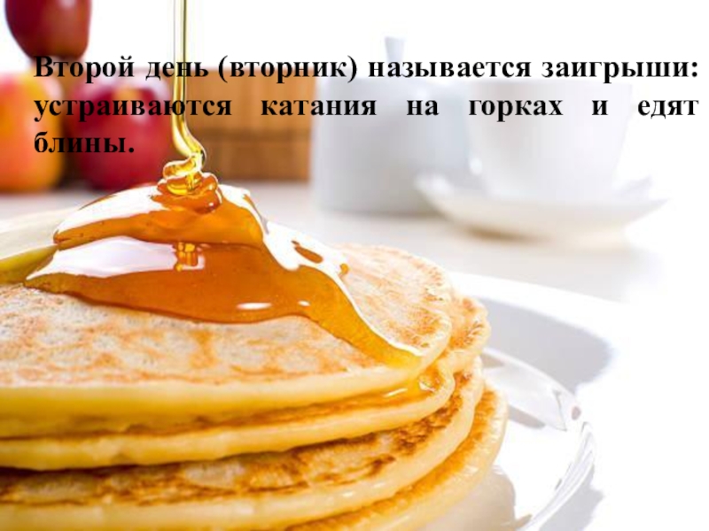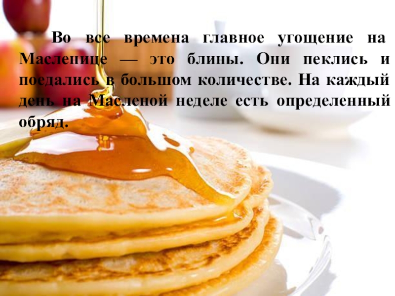 — это блины. Они пеклись и поедались в большом количестве. На каждый день на Масленой неделе есть определенный обряд.
