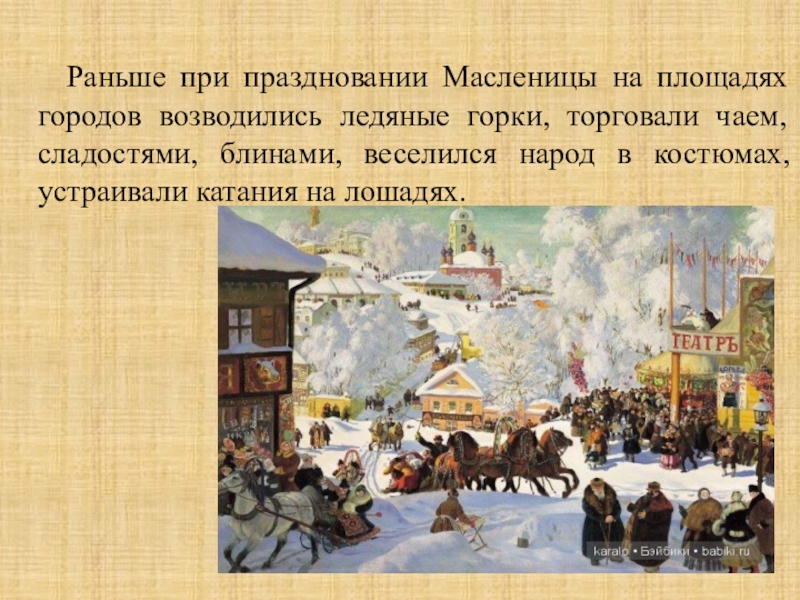 возводились ледяные горки, торговали чаем, сладостями, блинами, веселился народ в костюмах, устраивали катания на лошадях.
