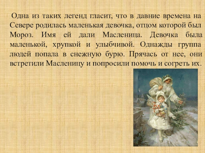 давние времена на Севере родилась маленькая девочка, отцом которой был Мороз. Имя ей дали Масленица. Девочка была маленькой, хрупкой и улыбчивой. Однажды группа людей попала в снежную бурю. Прячась от нее, они встретили Масленицу и попросили помочь и согреть их.