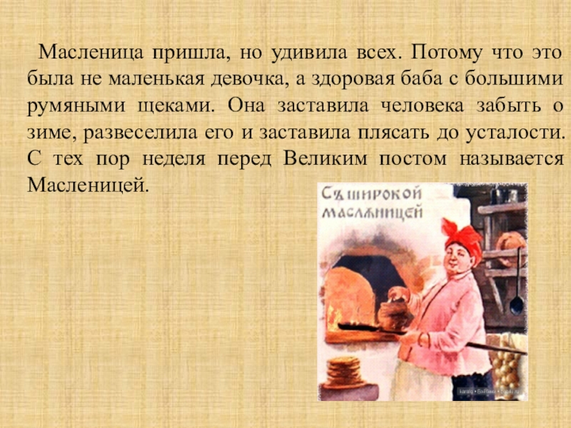 это была не маленькая девочка, а здоровая баба с большими румяными щеками. Она заставила человека забыть о зиме, развеселила его и заставила плясать до усталости. С тех пор неделя перед Великим постом называется Масленицей.