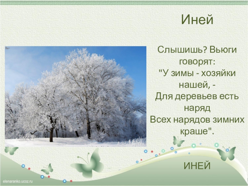 Слайд 13Иней Слышишь? Вьюги говорят: "У зимы - хозяйки нашей, - Для деревьев есть наряд Всех