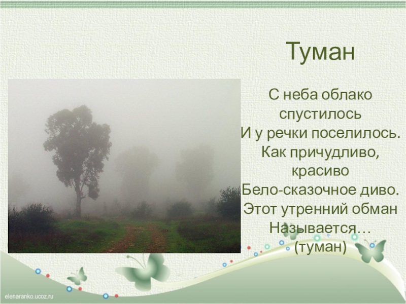 Туман  С неба облако спустилось И у речки поселилось. Как причудливо, красиво Бело-сказочное диво. Этот утренний