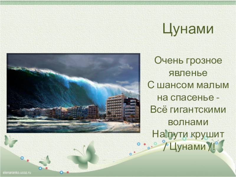Слайд 17Цунами Очень грозное явленье С шансом малым на спасенье - Всё гигантскими волнами На пути