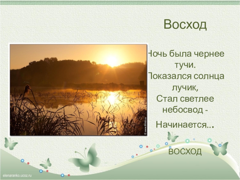 Слайд 2Восход Ночь была чернее тучи. Показался солнца лучик, Стал светлее небосвод - Начинается... ВОСХОД