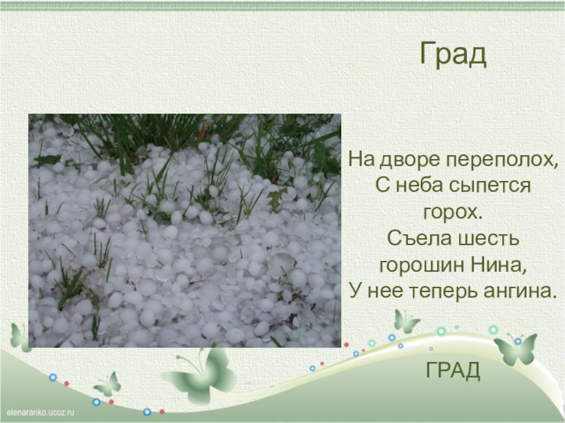 Слайд 11Град На дворе переполох, С неба сыпется горох. Съела шесть горошин Нина, У нее теперь