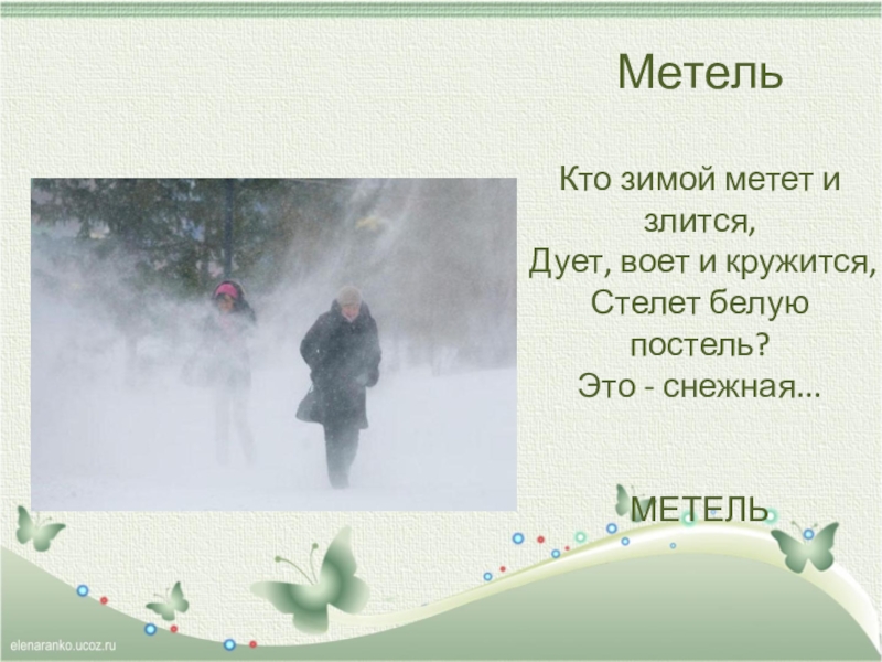 Метель  Кто зимой метет и злится, Дует, воет и кружится, Стелет белую постель? Это - снежная...
