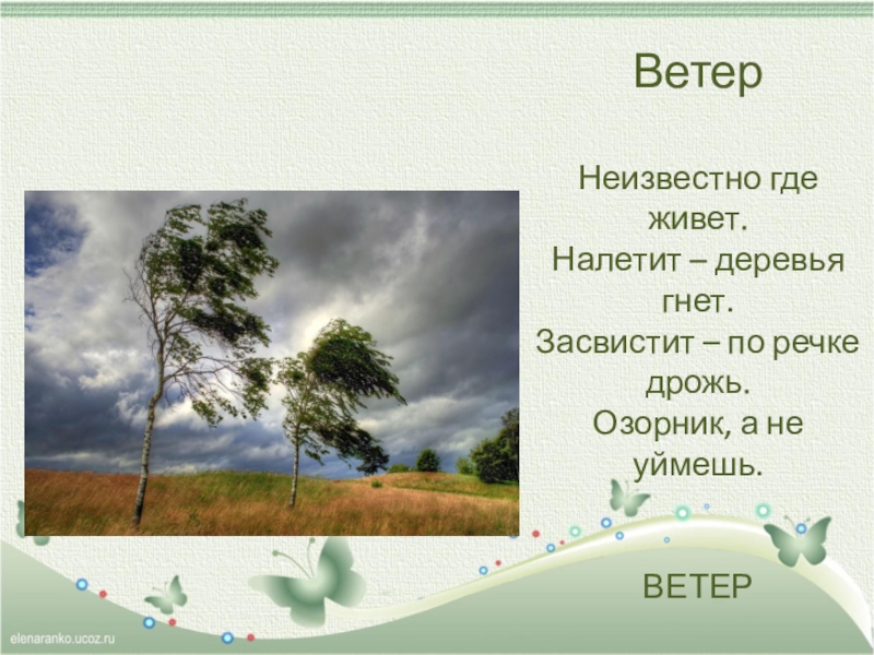 Слайд 9Ветер Неизвестно где живет. Налетит – деревья гнет. Засвистит – по речке дрожь. Озорник, а
