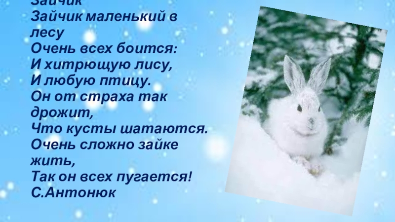 Слайд 6Зайчик Зайчик маленький в лесу Очень всех боится: И хитрющую лису, И любую птицу. Он от
