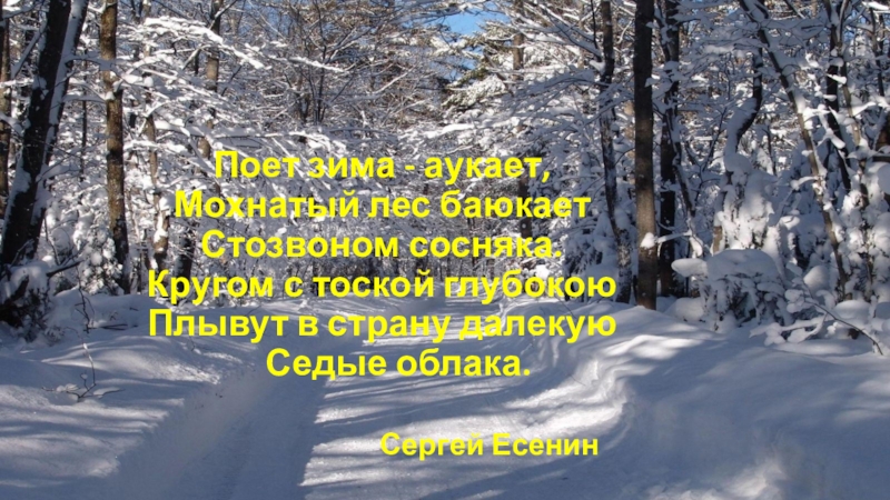 Слайд 9 Поет зима - аукает, Мохнатый лес баюкает Стозвоном сосняка. Кругом с тоской глубокою Плывут в