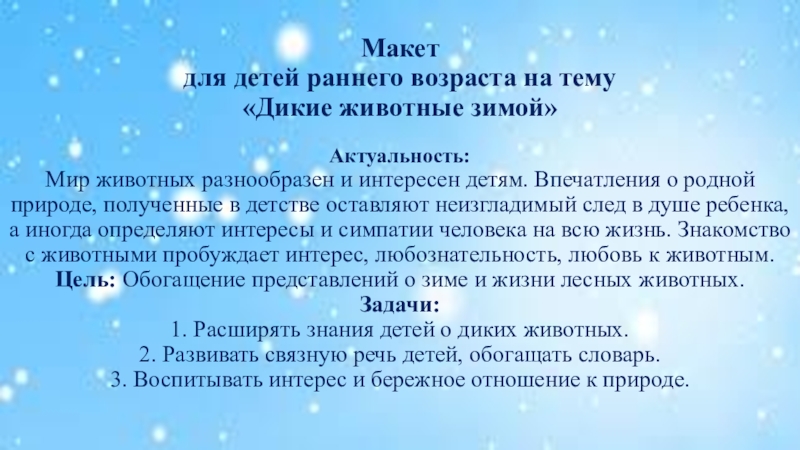 Слайд 3Макет для детей раннего возраста на тему «Дикие животные зимой» Актуальность: Мир животных
