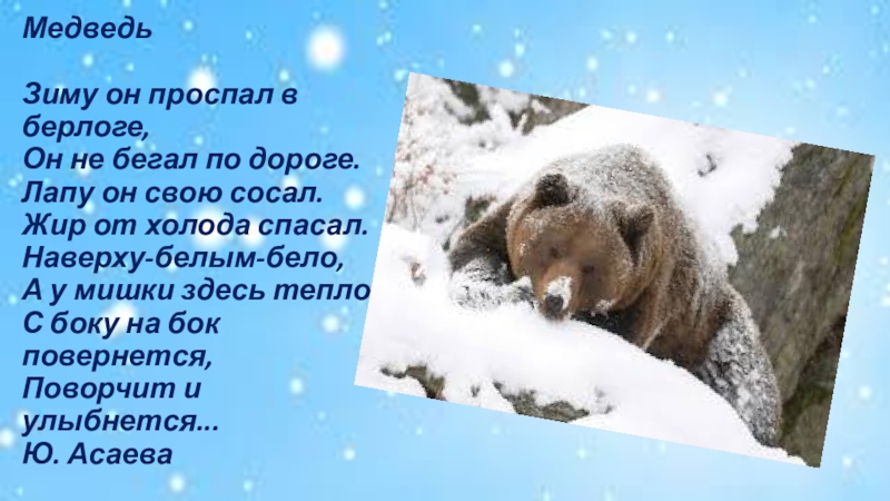 сосал. Жир от холода спасал. Наверху-белым-бело, А у мишки здесь тепло. С боку на бок повернется, Поворчит и улыбнется... Ю. Асаева