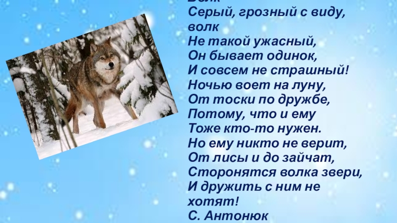 Слайд 7Волк Серый, грозный с виду, волк Не такой ужасный, Он бывает одинок, И совсем не