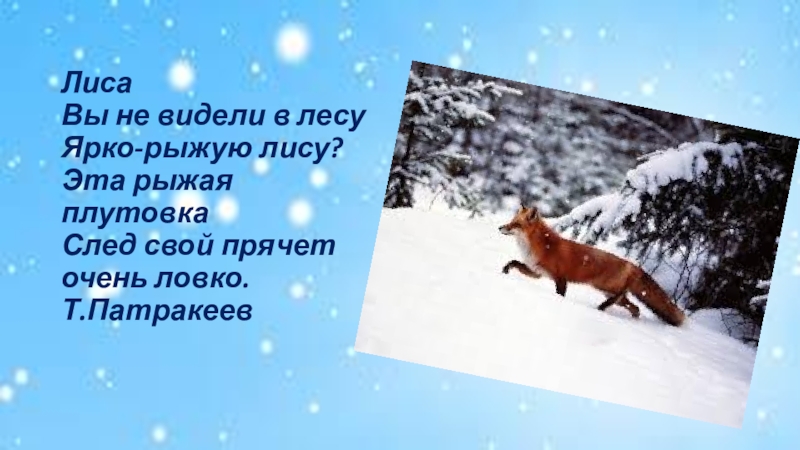 Лиса Вы не видели в лесу  Ярко-рыжую лису? Эта рыжая плутовка След свой прячет очень ловко.