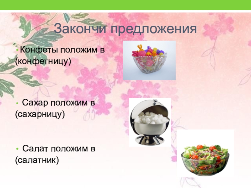 Закончи предложенияКонфеты положим в(конфетницу) Сахар положим в(сахарницу) Салат положим в(салатник)
