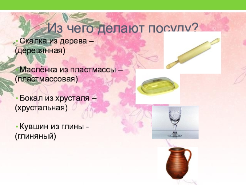 Из чего делают посуду?Скалка из дерева –(деревянная)Маслёнка из пластмассы –(пластмассовая)Бокал из хрусталя – (хрустальная)Кувшин из глины -