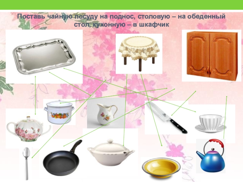 Слайд 5Поставь чайную посуду на поднос, столовую – на обеденный стол, кухонную