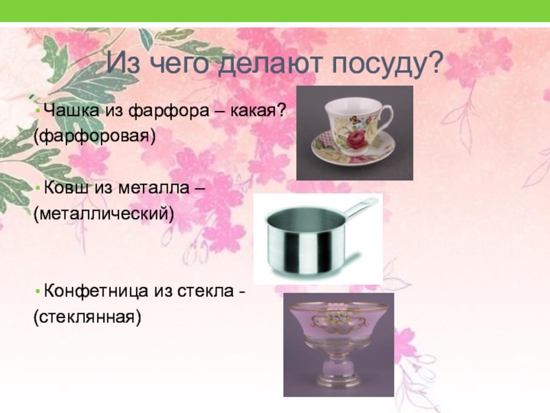 Из чего делают посуду?Чашка из фарфора – какая?(фарфоровая)Ковш из металла – (металлический)Конфетница из стекла -