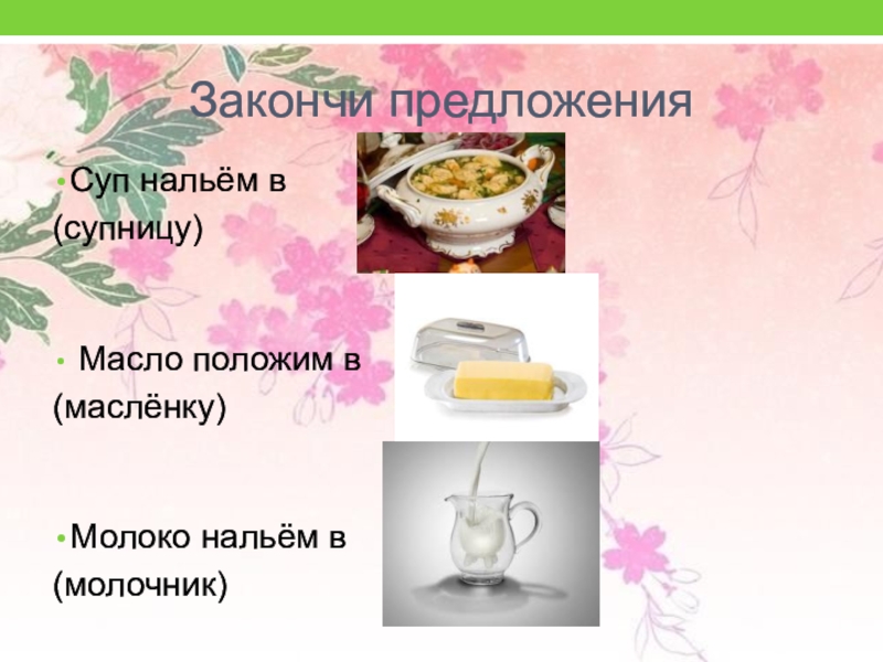 Закончи предложенияСуп нальём в(супницу) Масло положим в(маслёнку)Молоко нальём в(молочник)