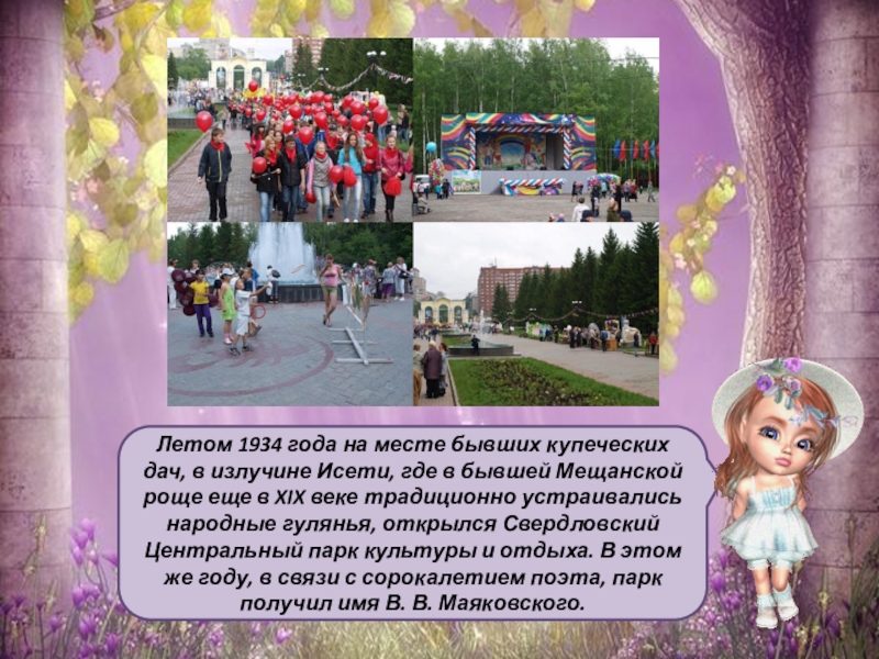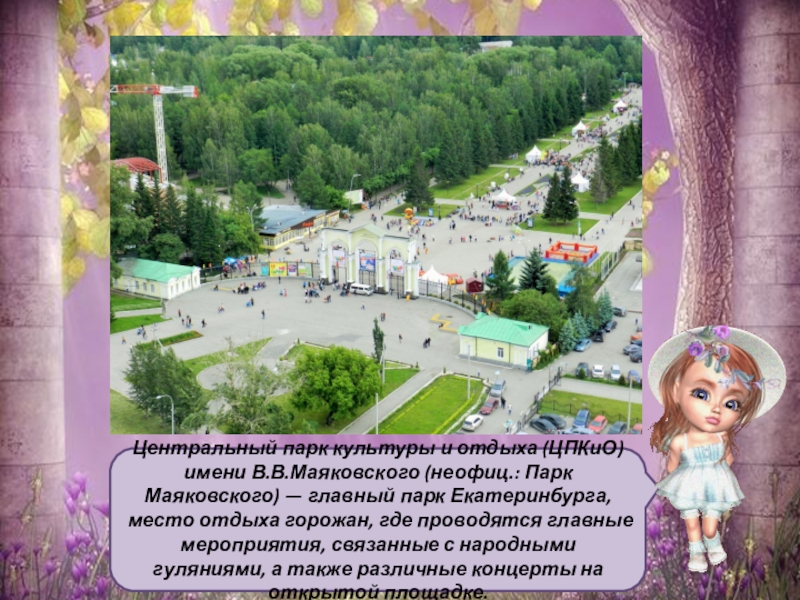 Слайд 22Центральный парк культуры и отдыха (ЦПКиО) имени В.В.Маяковского (неофиц.: Парк Маяковского) — главный парк Екатеринбурга,