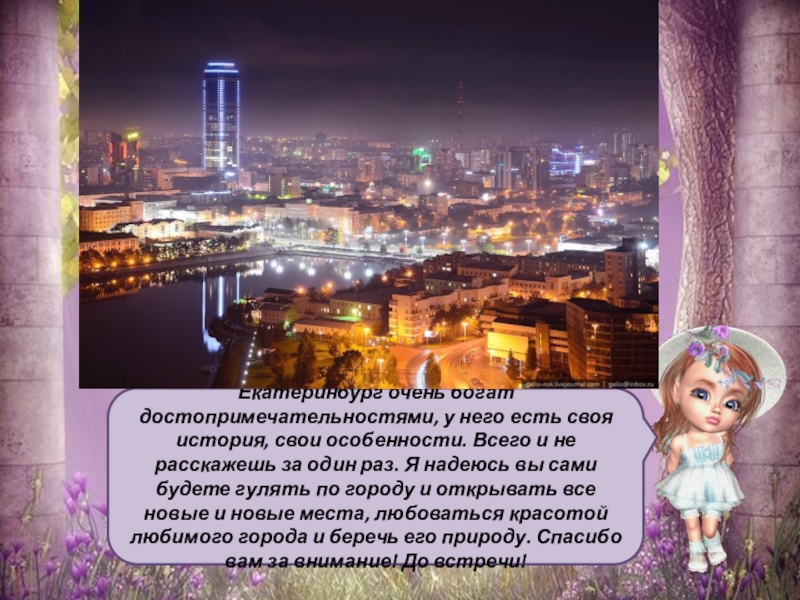 Всего и не расскажешь за один раз. Я надеюсь вы сами будете гулять по городу и открывать все новые и новые места, любоваться красотой любимого города и беречь его природу. Спасибо вам за внимание! До встречи!