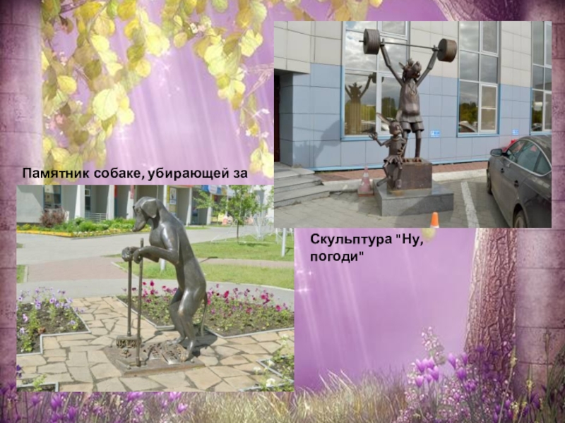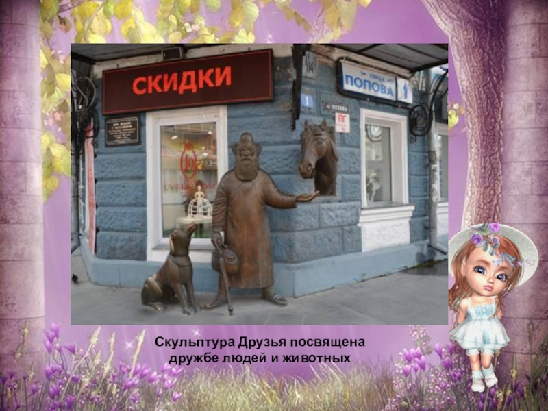 Слайд 34Скульптура Друзья посвящена дружбе людей и животных