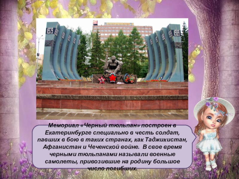Слайд 14Мемориал «Черный тюльпан» построен в Екатеринбурге специально в честь солдат, павших в