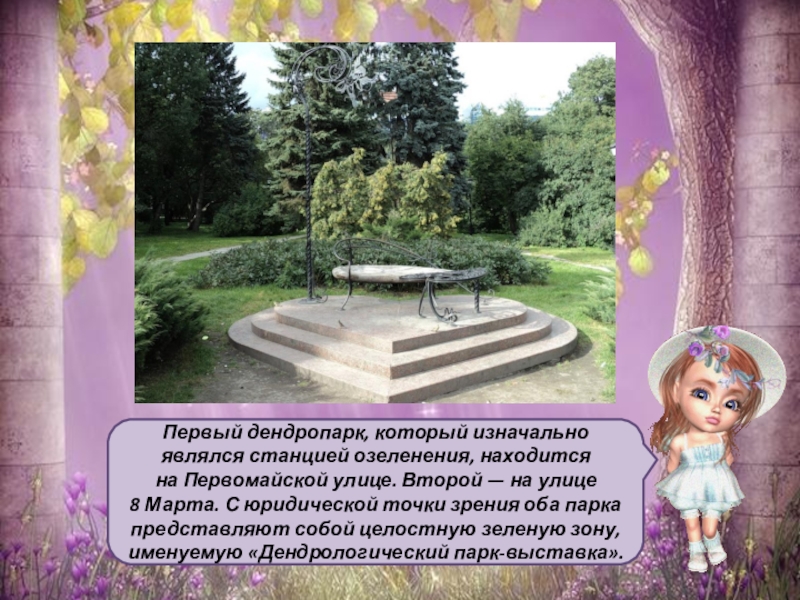 Слайд 18Первый дендропарк, который изначально являлся станцией озеленения, находится на Первомайской улице. Второй —