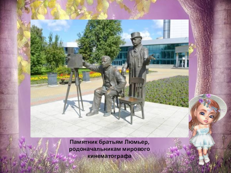 Слайд 31Памятник братьям Люмьер, родоначальникам мирового кинематографа