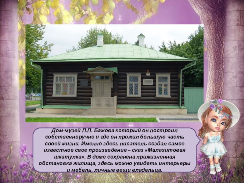 часть своей жизни. Именно здесь писатель создал самое известное свое произведение – сказ «Малахитовая шкатулка». В доме сохранена прижизненная обстановка жилища, здесь можно увидеть интерьеры и мебель, личные вещи владельца.