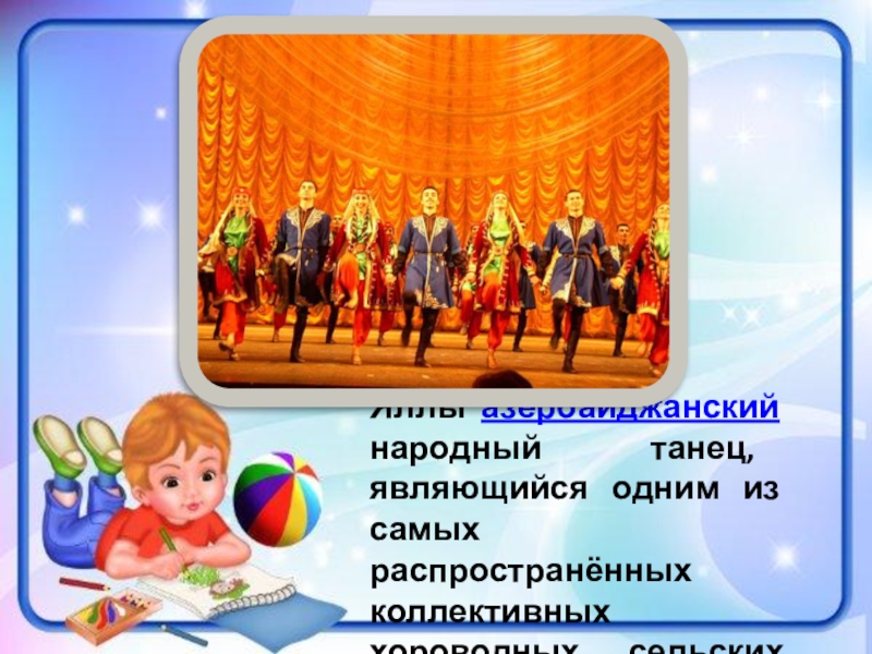 Слайд 13Яллы  азербайджанский народный танец, являющийся одним из самых распространённых коллективных хороводных сельских танцев.