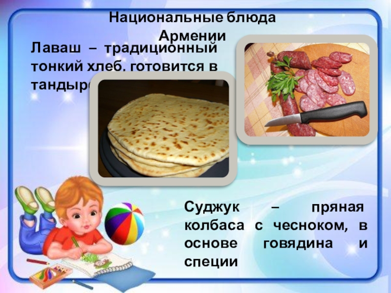 Лаваш – традиционный тонкий хлеб, готовится в тандыреНациональные блюда АрменииСуджук – пряная колбаса с чесноком, в основе
