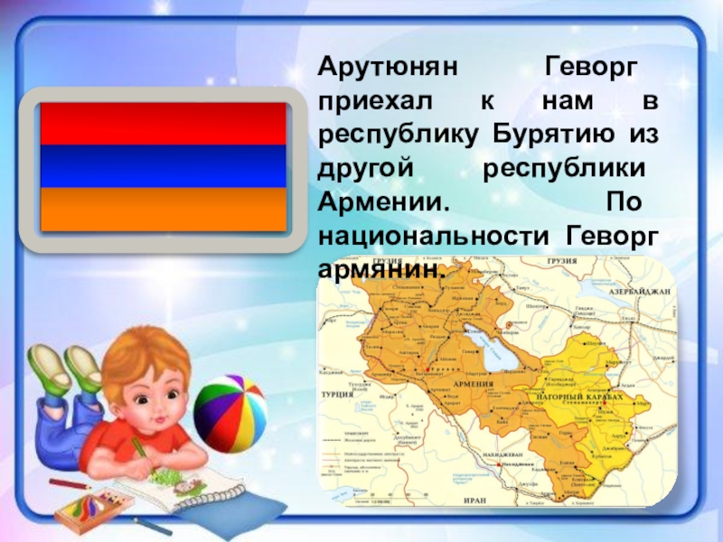 Слайд 15Арутюнян Геворг приехал к нам в республику Бурятию из другой республики