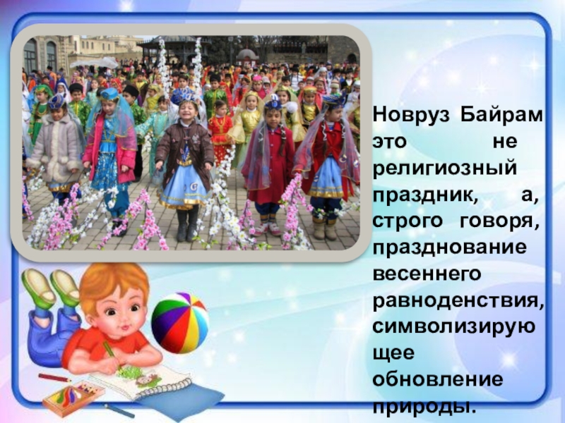Слайд 12Новруз Байрам это не религиозный праздник, а, строго говоря, празднование весеннего