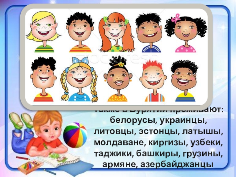 Слайд 6Также в Бурятии проживают: белорусы, украинцы, литовцы, эстонцы, латышы, молдаване, киргизы,