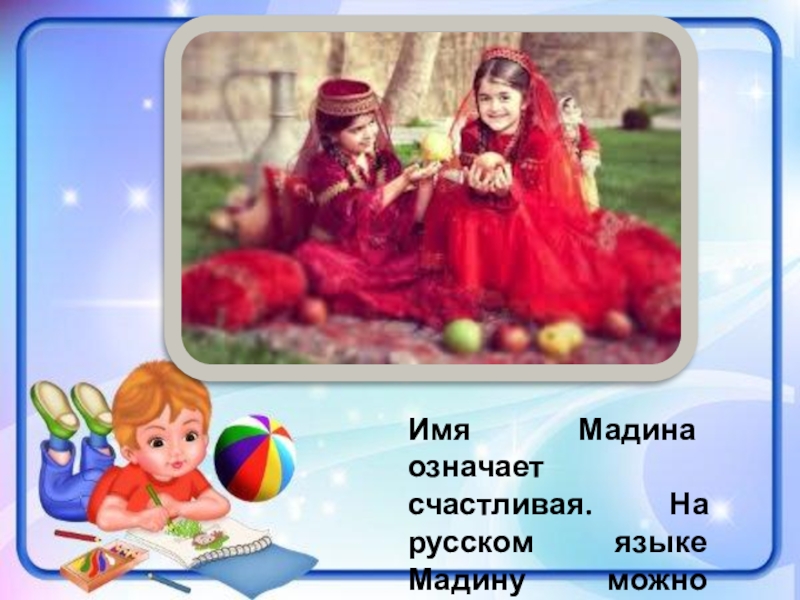 Слайд 11Имя Мадина означает счастливая. На русском языке Мадину можно называть Дина.