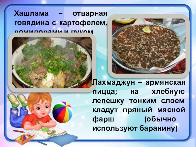 Хашлама – отварная говядина с картофелем, помидорами и лукомЛахмаджун – армянская пицца; на хлебную лепёшку тонким слоем