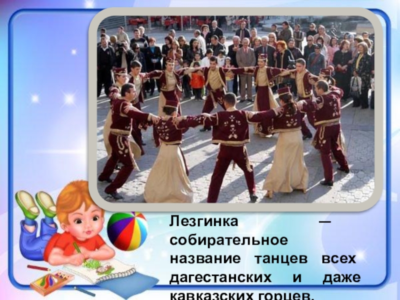 Слайд 20Лезгинка — собирательное название танцев всех дагестанских и даже кавказских горцев.