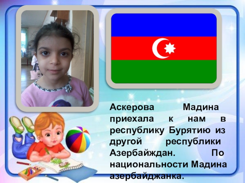 Слайд 8Аскерова Мадина приехала к нам в республику Бурятию из другой республики