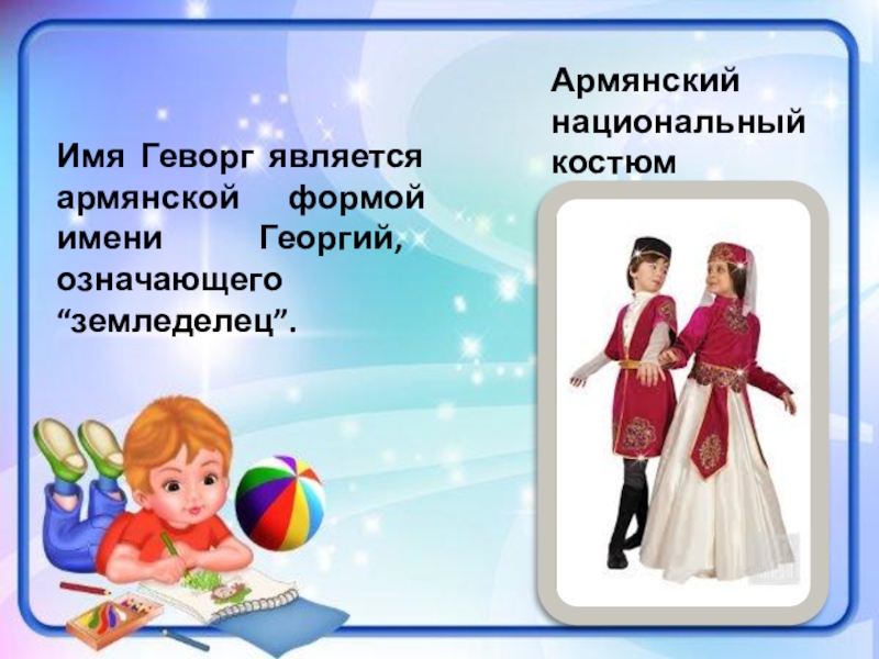 Армянский национальный костюмИмя Геворг является армянской формой имени Георгий, означающего “земледелец”.