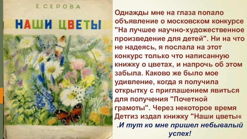 научно-художественное произведение для детей". Ни на что не надеясь, я послала на этот конкурс только что написанную книжку о цветах, и напрочь об этом забыла. Каково же было мое удивление, когда я получила открытку с приглашением явиться для получения "Почетной грамоты". Через некоторое время Детгиз издал книжку "Наши цветы«