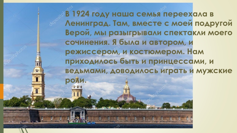 В 1924 году наша семья переехала в Ленинград. Там, вместе с моей подругой Верой, мы разыгрывали спектакли