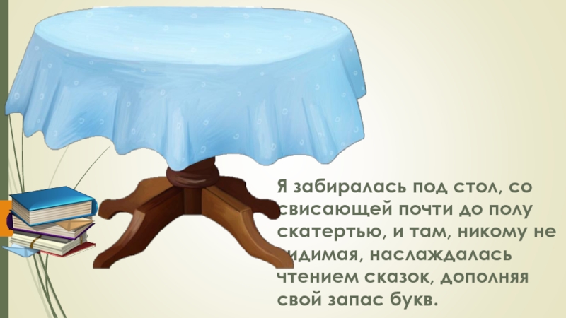 Слайд 5Я забиралась под стол, со свисающей почти до полу скатертью, и