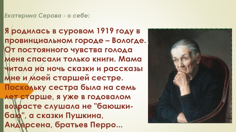 Слайд 3Екатерина Серова - о себе: Я родилась в суровом 1919 году в